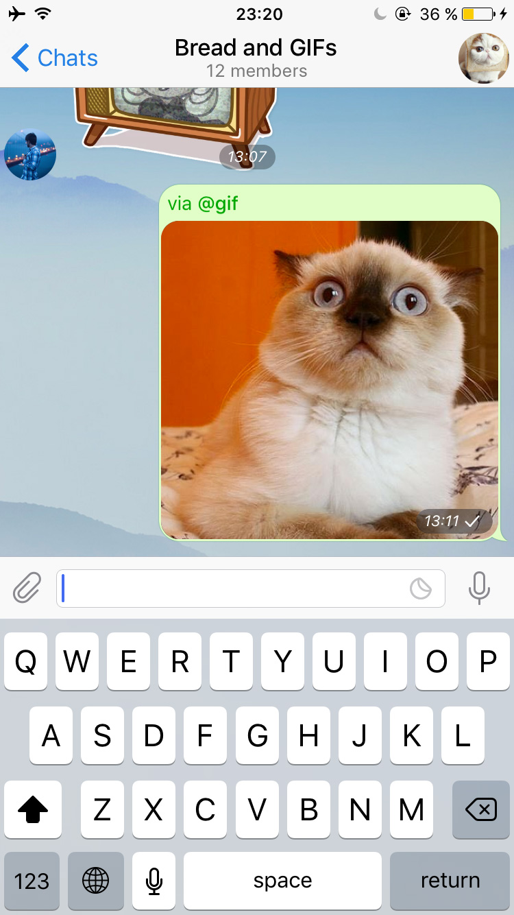 Tap on an item to instantly send it to the chat. This way you can share stuff from bots without any hassle. Inline bots don't see any messages in your chats – they only receive what you type after their username in the input field.